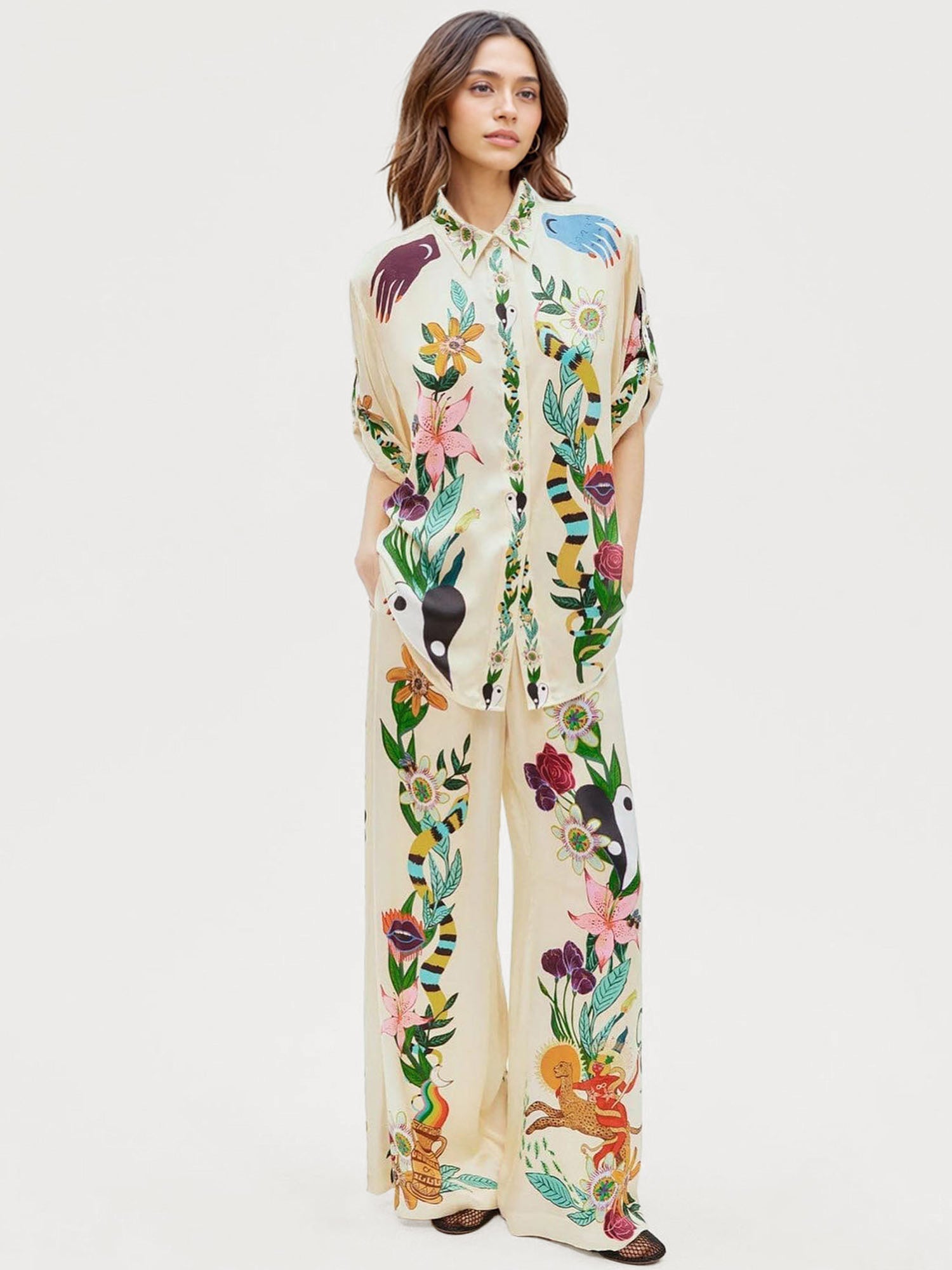 Completo Satinato con Stampa Sofisticata – Camicia Oversize e Pantaloni Coordinati